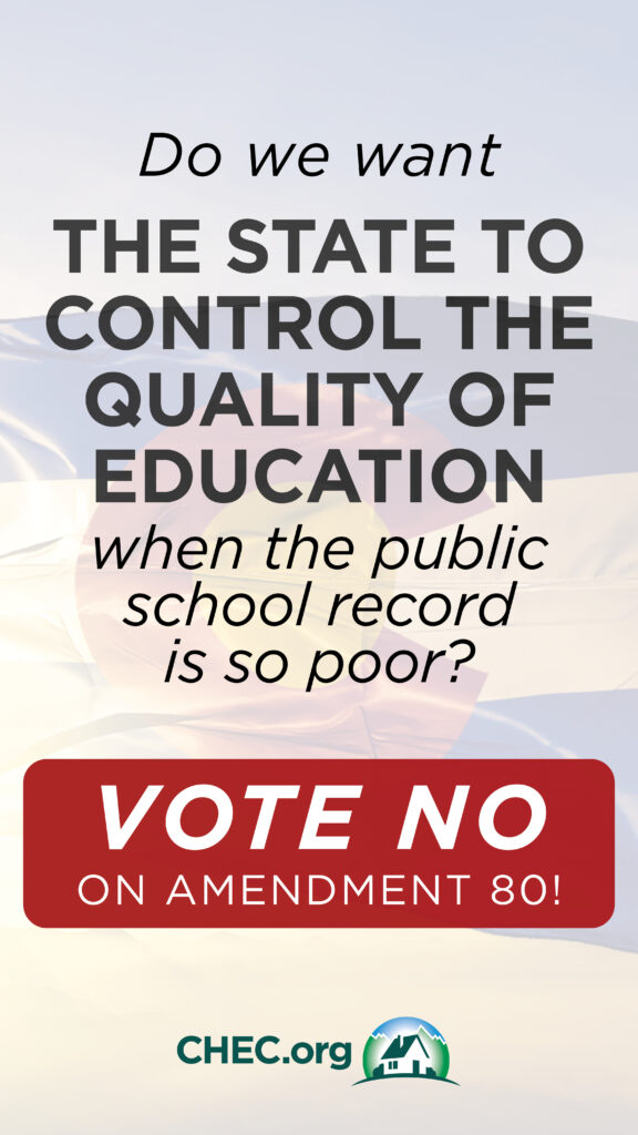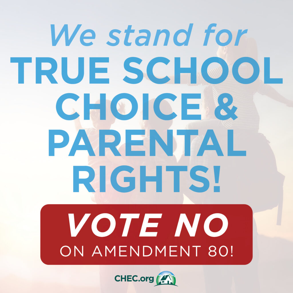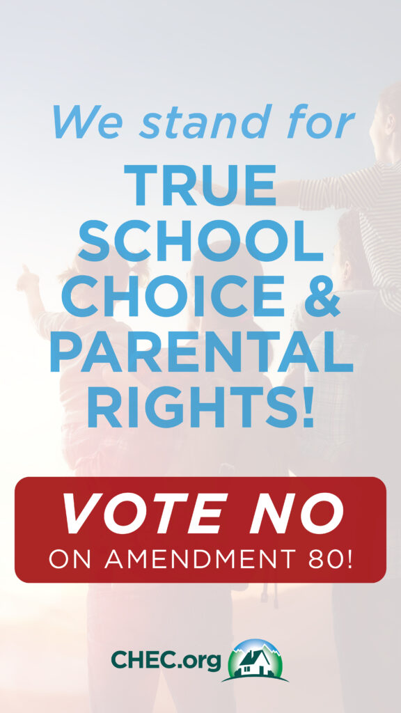The defeat of Amendment 80 is bittersweet. CHEC will always support the ability of parents to make decisions concerning their children’s education. We believe the wording in the amendment fell short of that goal because it would have added harmful language into our constitution. Our concern regarding giving children the right to a quality education and to school choice remains, as does the bureaucratic and legislative thirst for removing parental authority from the family, as well as, their appetite to quench educational freedom through oppressive regulations and laws.