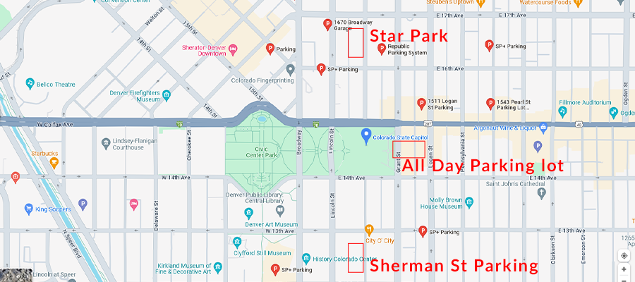 The address for the state capitol is 200 E. Colfax Avenue, Denver, CO 80203. There is ample parking all around the Capitol building! Here are three great options close to the Capitol Building.